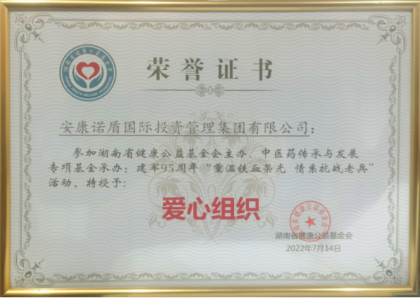 為銘記歷史、關愛老兵,傳承愛國主義精神,2022年7月14日,由湖南省健康公益基金會主辦,安康諾盾國際投資管理集團有限公司等單位協辦的“重溫鐵血榮光,情系抗戰老兵——關愛抗戰老兵金井行”活動在長沙縣金井鎮湘豐村舉行,特別慰問了長沙縣97歲抗戰老兵柳元青。為老兵送去關懷和溫暖,聆聽革命故事,接受紅色歷史的洗禮。